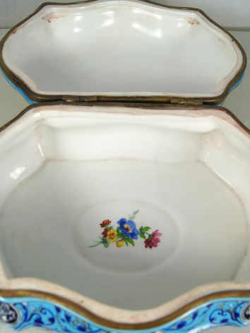 The box features a vibrant "Bleu Celeste" color which in English translates to heavenly blue, and is a soft but bright shade of blue. This hue, according to scholarship on color theory, is said to be derived from Saxon blue and Saxon green which are rich colors developed by the Meissen porcelain factory in Germany. This beautiful vintage collectible is elaborately decorated with hand-painted floral motifs and gilded scrollwork and is securely fastened with an ornate gilt-bronze hinge and clasp.