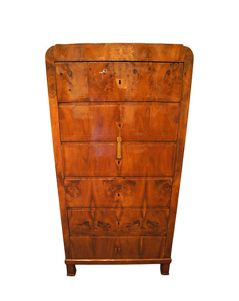 The Biedermeier bureau or chiffoniere is a sophisticated high chest of drawers manufactured between 1815 and 1848. A chiffonier (or chiffonnier) is a type of tall, narrow chest of drawers, often with multiple small drawers, used for storing lingerie, linens, or other personal items, originating from French furniture styles and popular in periods like Empire, Biedermeier, and Art Deco. It is known for its compact elegance and organizational purpose. While often the work of anonymous master craftsmen, this style originated in Germany and Austria to serve the rising middle class.